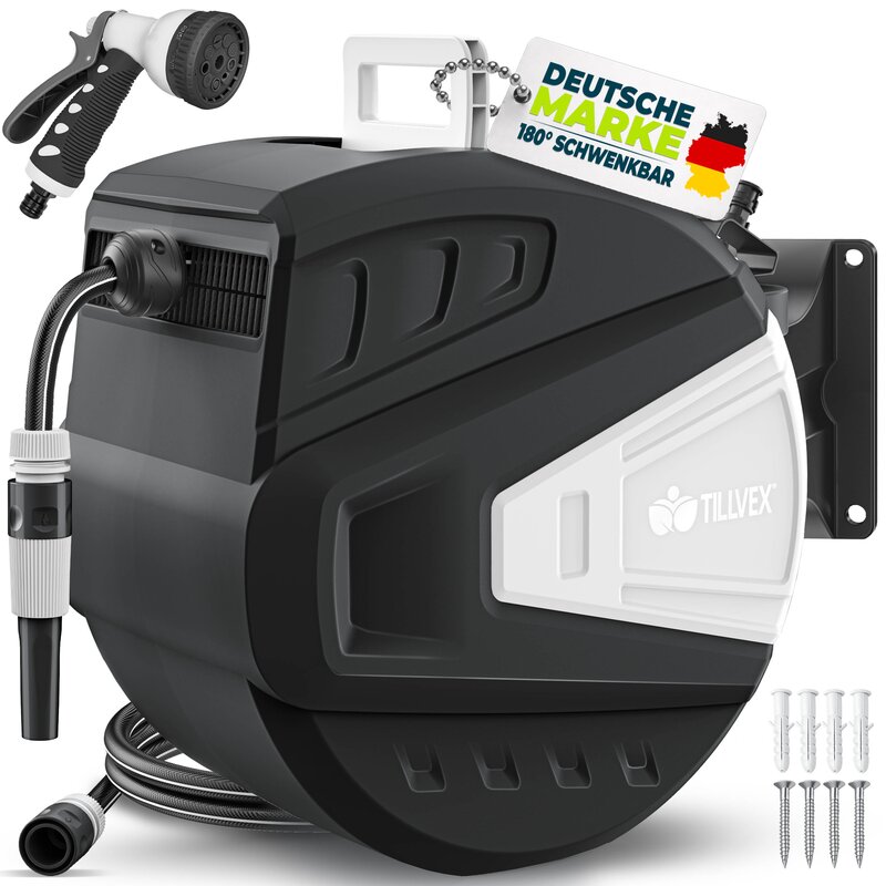 tillvex Schlauchtrommel Wasser mit Wandhalterung + Tragegriff | Schlauchaufroller mit Handbrause und Gartenschlauch | 180° Schwenkbar | Wand-Schlauchbox mit Aufroll-Automatik